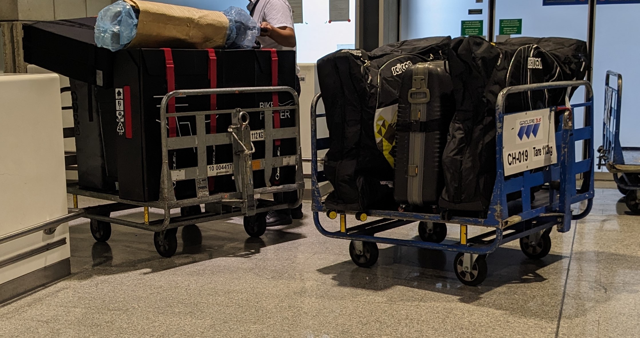 問題の輪行箱はこれまた1hほどかけて出てくる、果たして無事なのかみんな不安な中、積み上げかれたカートがΣ(´▽`)…。