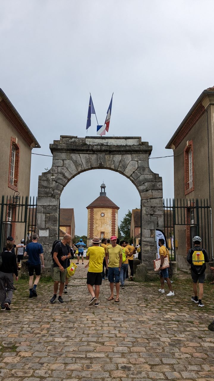 いよいよスタート時間となり旅が始まる。センサーの位置がちょっと先なのである意味パレード走行?数分遅れでセンサー通過しいざスタート!。ランブイエ城の門のところの石畳みに一旦気をつけて通り抜け車道へ。