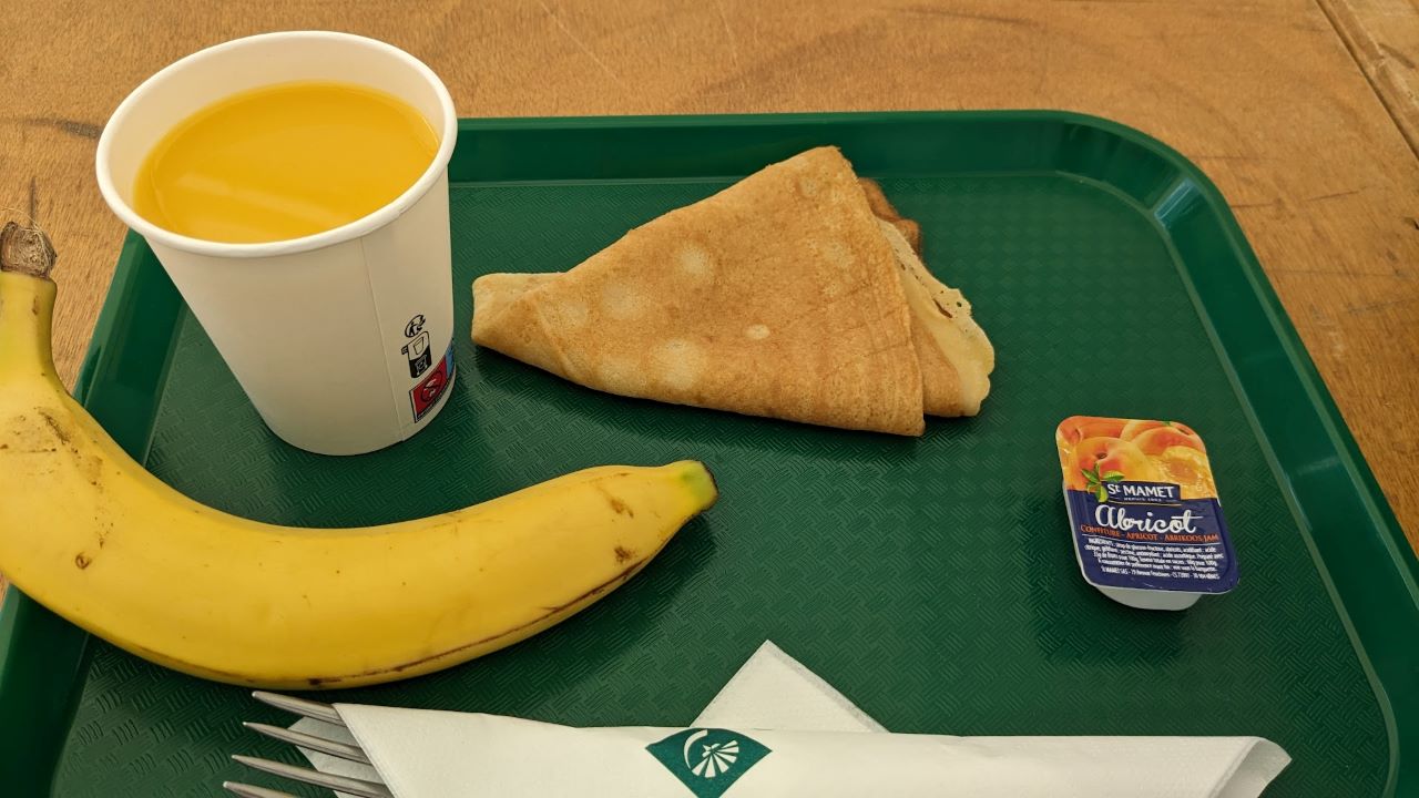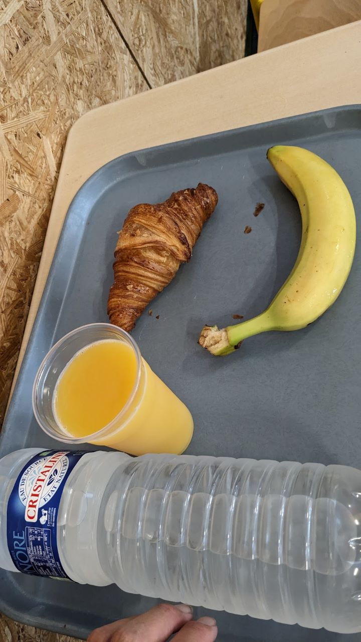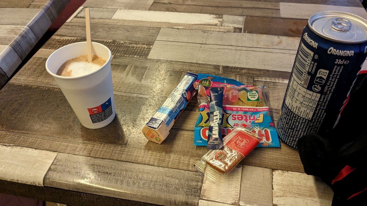 PC1に到着して、スタンプ押してもらって、レストランでバナナ、オランジーナ、謎スープを買い、テーブルでもぐもぐ。