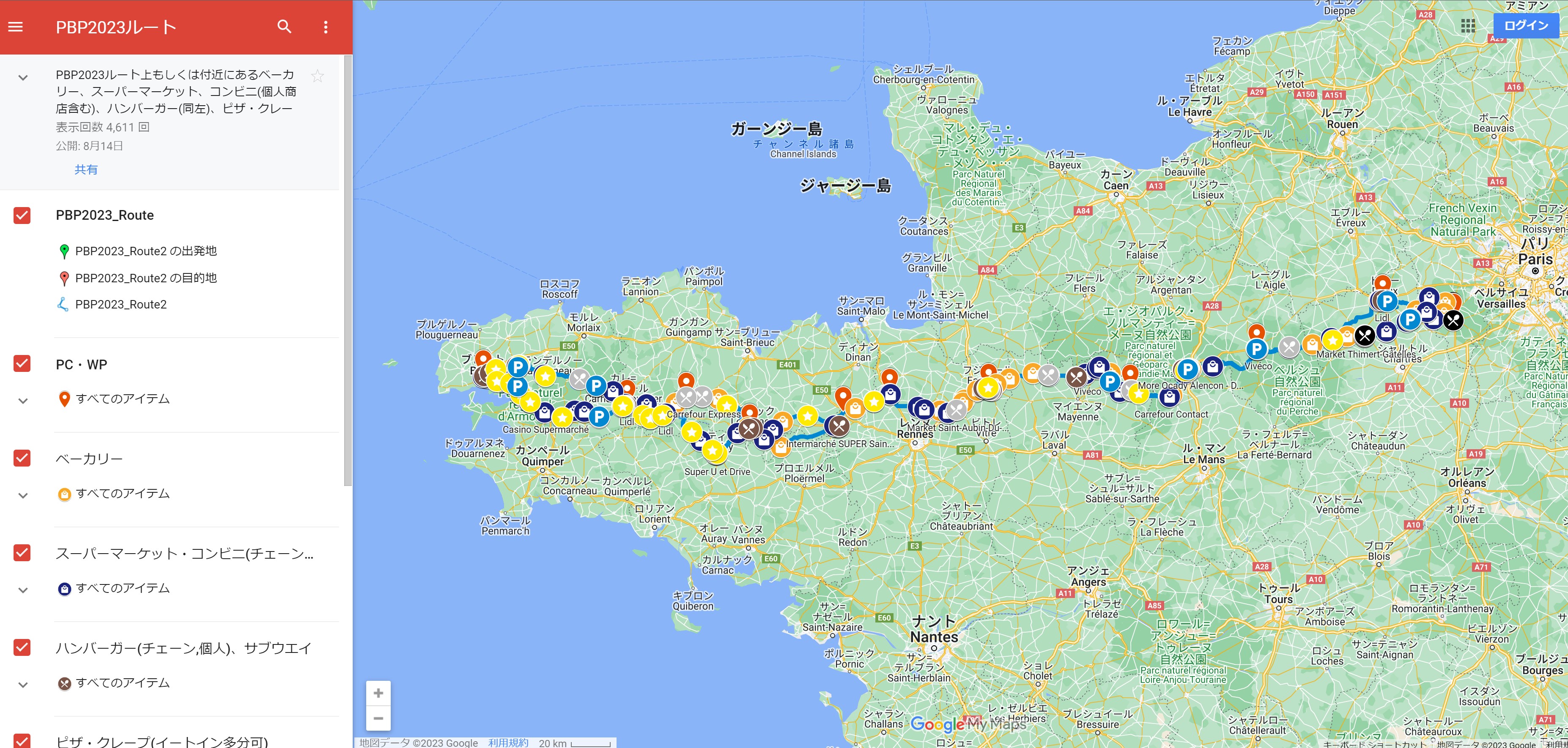 あとGoogleのマイマップでPBPのルートをインポート。コース上にある、ベーカリー、スーパーマーケット(コンビニ)、ハンバーガー、ピザ、トイレ、GSといった施設をウェイポイントとしてメモ。共有公開したところ見ていただけたようで大変うれしかったです(お役に立てたかな?)