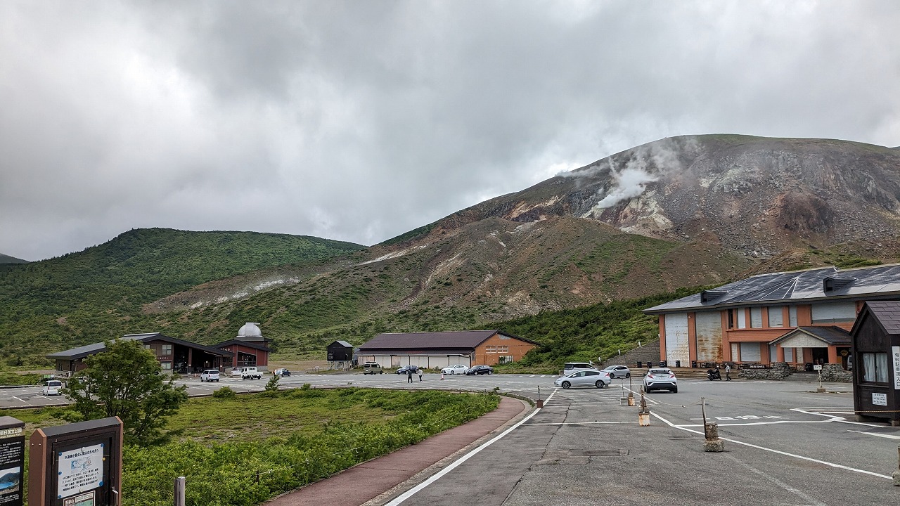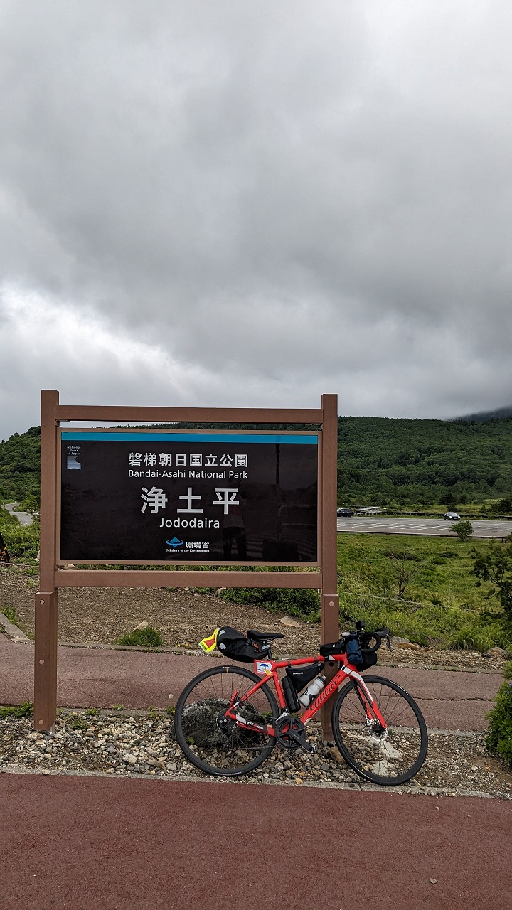 火山ガス地帯は止まったら危険の看板があったので必死に耐えながら漕ぐ。坂を超えたところで浄土平着PC4。写真撮ろうにも普通なら倒れてるだろうな感じな車体を傾けて立てかけてやっと撮れた(´▽`;)