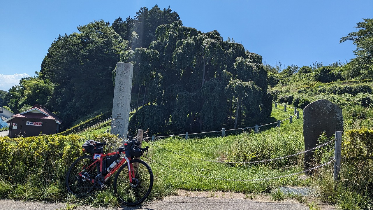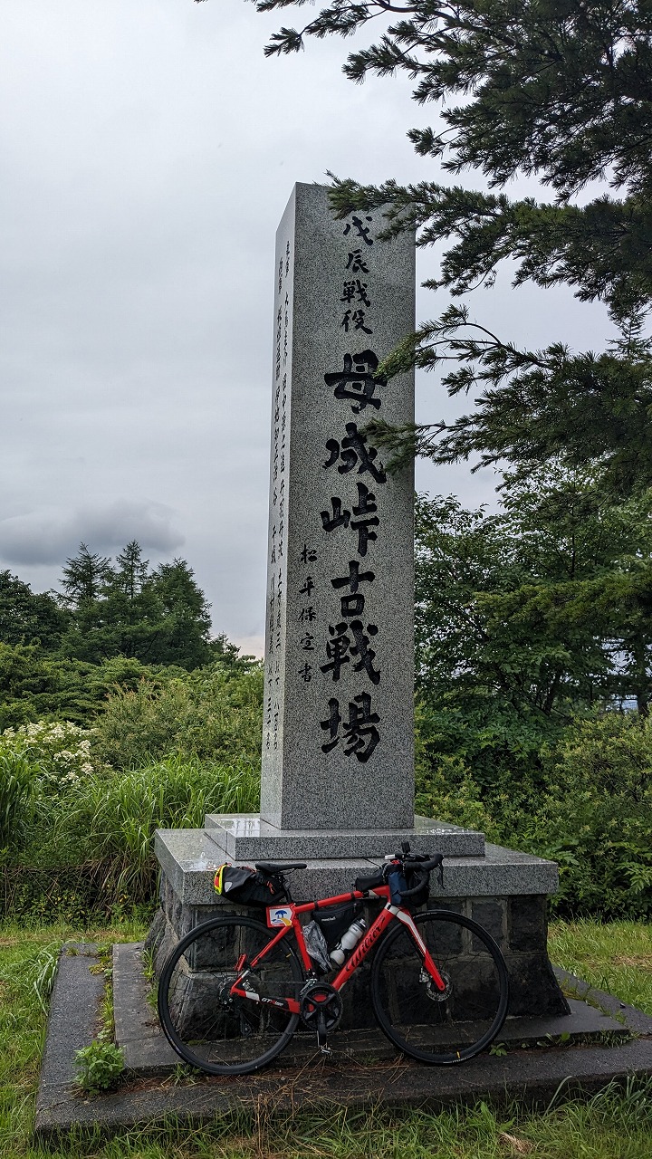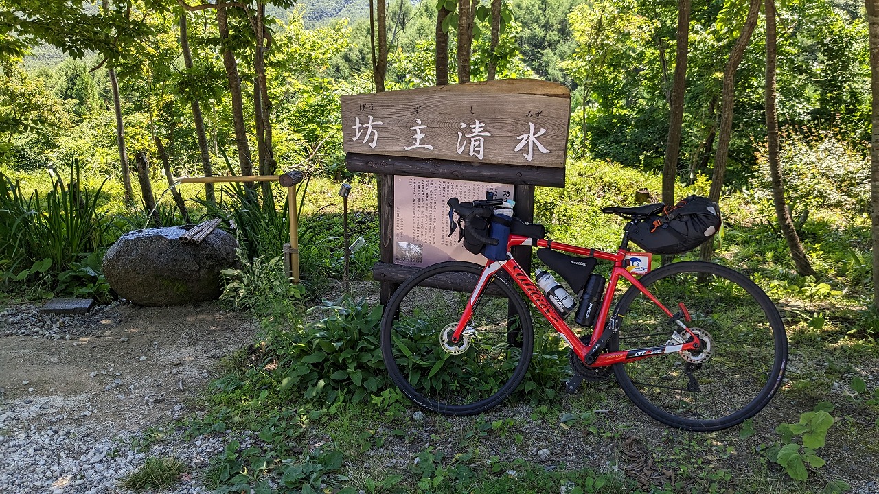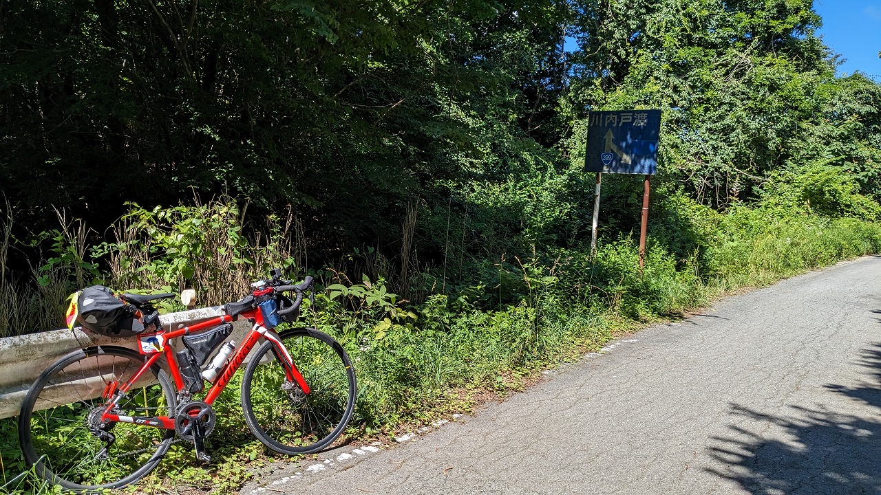 回復が微妙で目の前の坂でもうだめかと思ったが登り終わりで湧き水があり、ちょうど車で来ていた方が水あるよー!と声をかけてくれたのでDASH!‼、腕も足も濡らして生き返った!!ボトルの水も交換。しばしその方と会話(クロモリロードを乗ってるとのこと)、お別れして。少しすると下り、気化熱のおかげもあり一気に冷える。