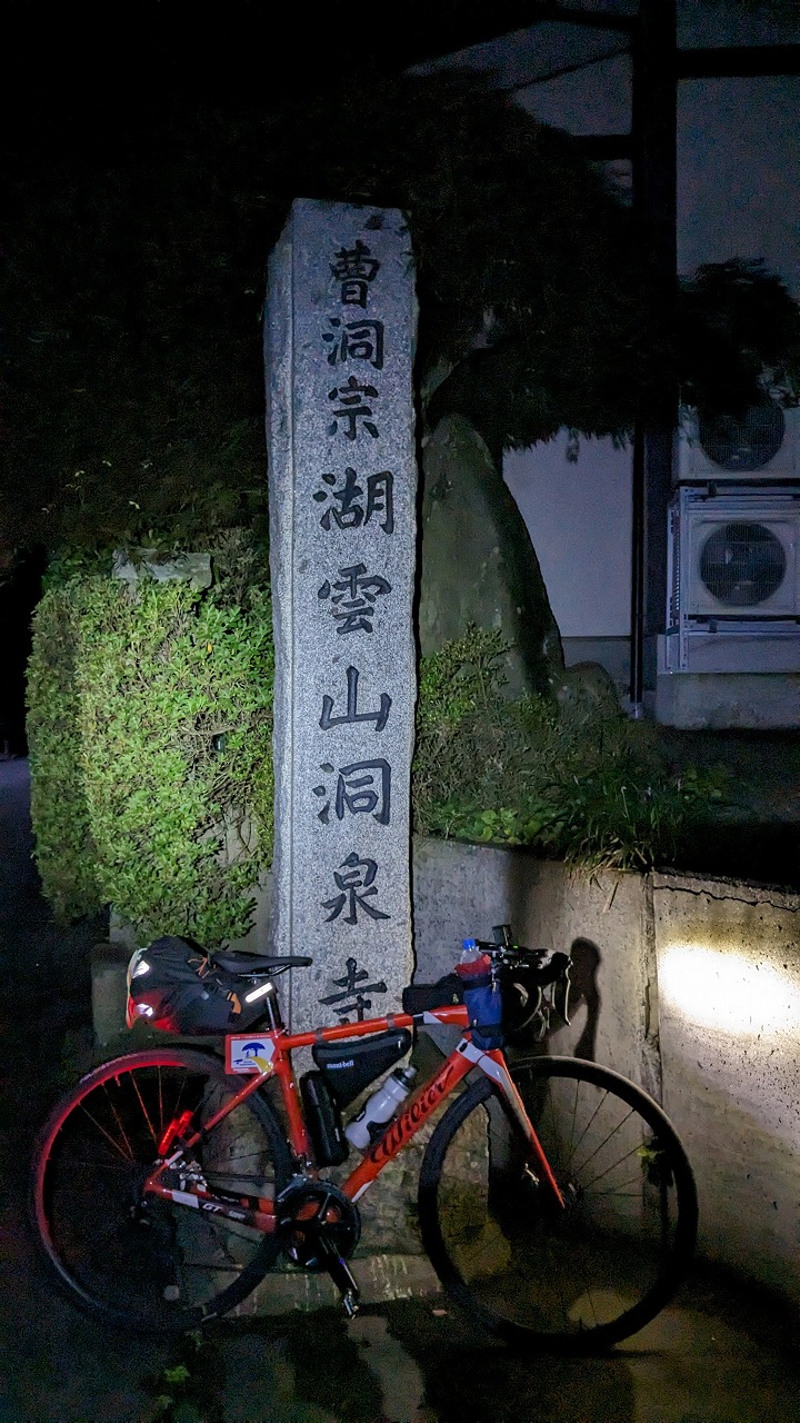 ルート復帰前のところでコンビニも発見し、おにぎり、グミ、野菜ジュースを買う。18時半とかになってたけどとりあえず今のまま速度維持で。予定では24時までに間に合えばよいが間に合わないか?と考えながら走る