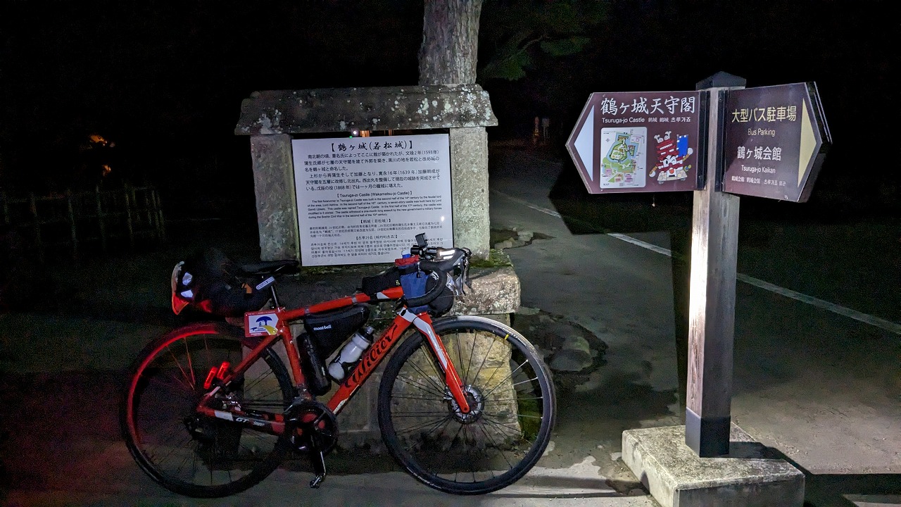 最後の下りで少し稼いでPC7の鶴ヶ城には24時前に着いた。一昨年来たときは桜咲いてたなぁと思い出しながら、チェック対象になりそうな看板を見つけて写真を撮る。