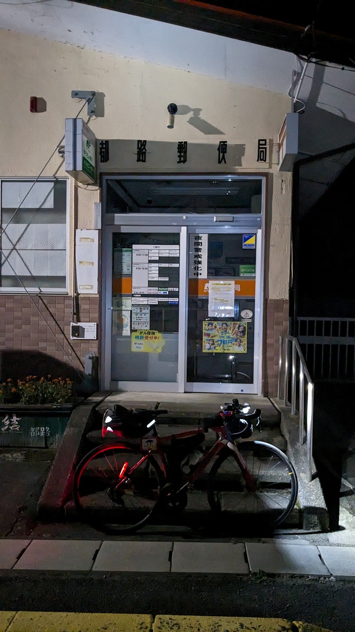 とっぷり夜も更けてひたすら走ってファミマ発見、晩御飯、サラダとおにぎりとか。ちょっと虫が多かったかな。その先にPC12郵便局。ひっそりとしているがパチリ。