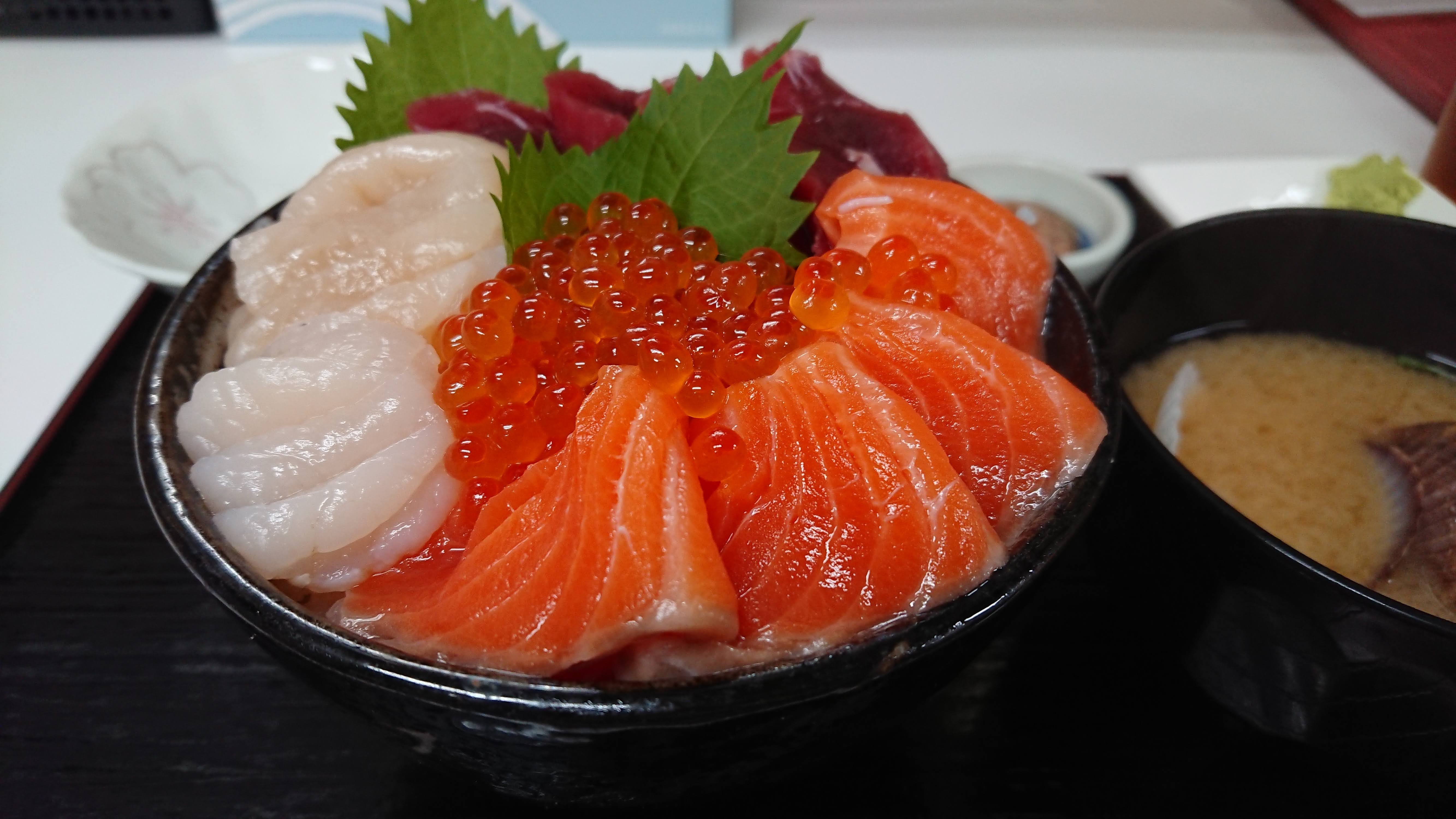 やはり市場内の店はどこも混んでて無理かな~と諦めつつちらちら除いていたらカウンター席空いてるよと声をかけられ、入店。値段は観光地価格なので高いけどせっかく来たからね。3種のネタを選べるどんぶりにして注文。ちょっとしたら来た。