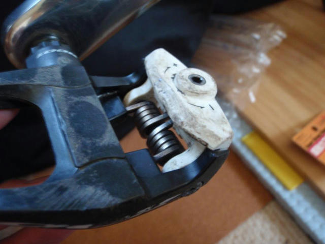 ナンだろう( ̄~ ̄;)と思いながらLookのグレークリートなので左右にひねって見るとどうやらここらへんが怪しそう・・・・。左クリートは右からのお下がりなのでどっか削れてるのかなと思い、試しにKeoカーボンのバネを強めてみたが効果なし。