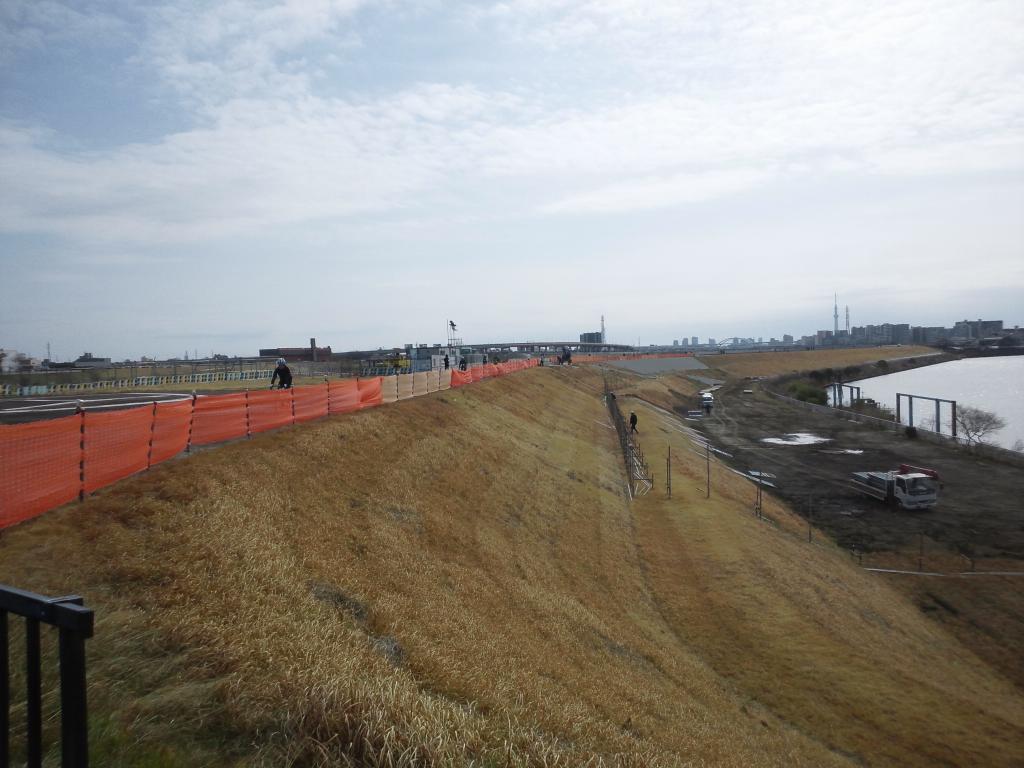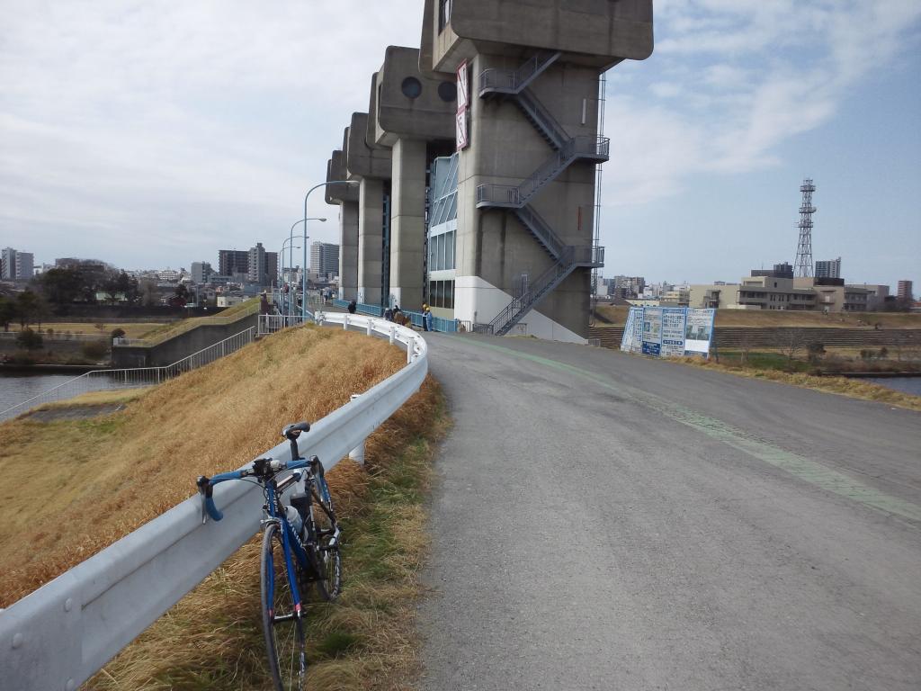北西の風だったので行きは辛いが他に走っているロードのも辛そうだったので一緒か・・・。ごぼう抜きでぴゅーっとも行かずたまにトレイン状態になったりしながら20ちょい超えでコギコギ、掘切橋辺りが相変わらず工事なので諦めて車道にでて迂回・・・。更に北上して横風やら向かい風やらを喰らいながら水門~のところにあとちょっとで着く!と思ったらまた砂利道。しかも迂回不可能=□○_仕方なく途中で降車。