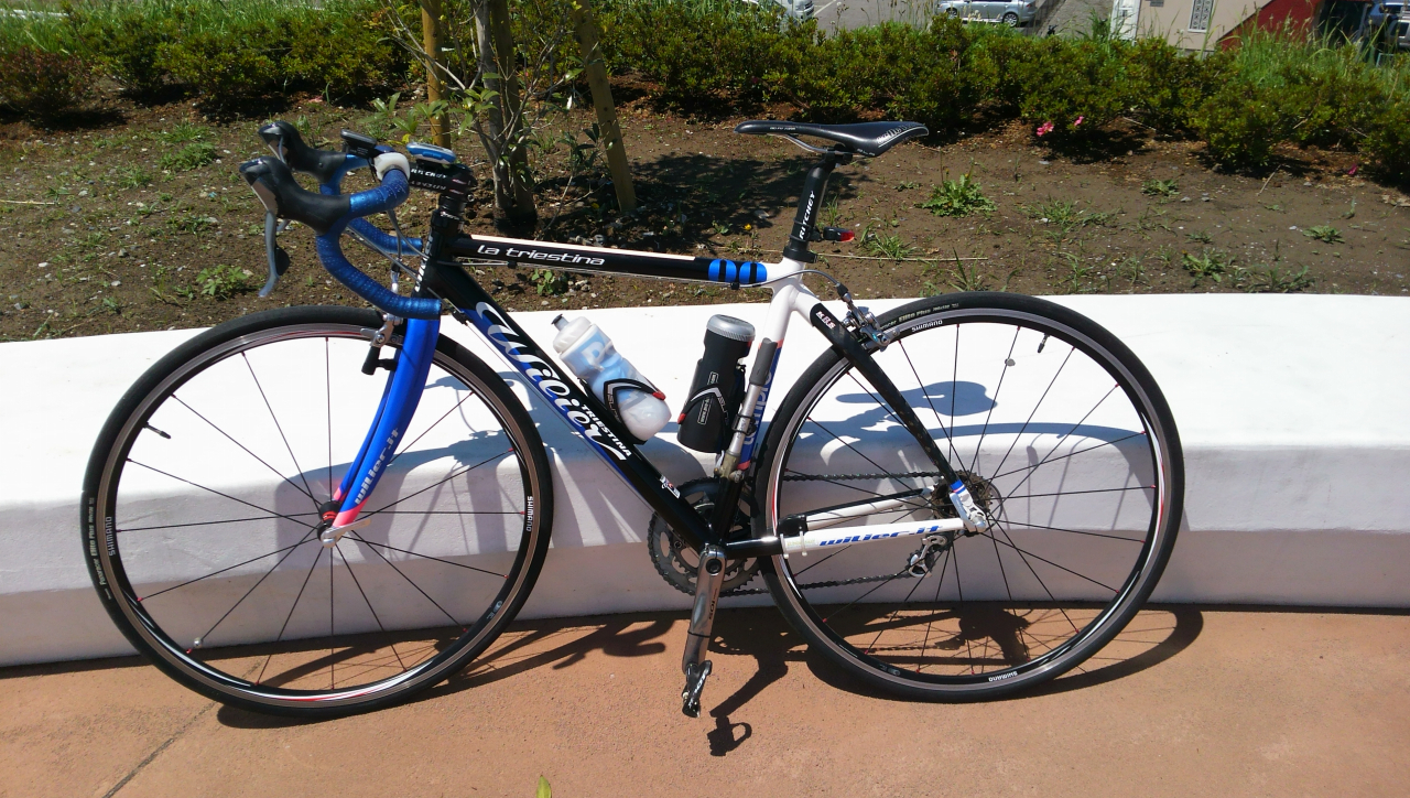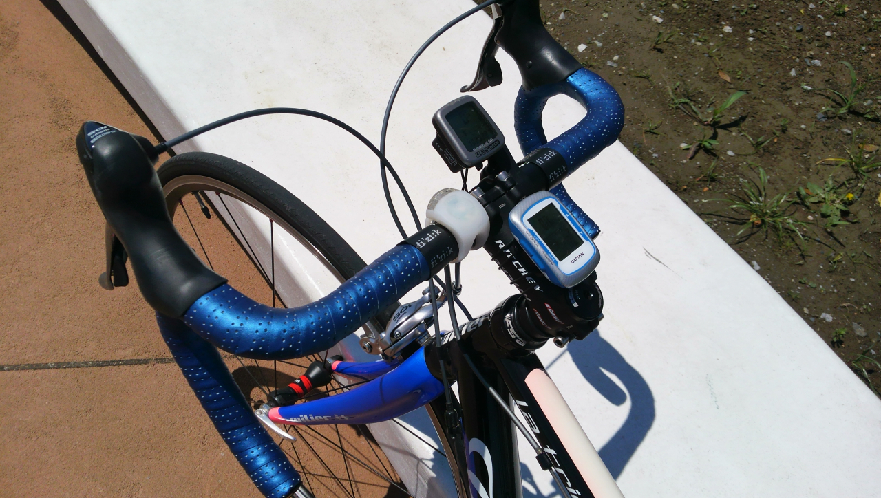 そういえばGWのとき初めてバーテープ巻き巻きしてみました、色は濃い青に、フィジークの通気性良さそうなやつですわ。