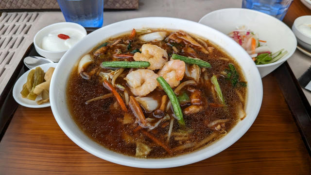 しばらく走ってお昼リサーチ済みとのことでそのお店に寄る。中華屋さんで餡掛け麺。ちょうど食べ終わりで出てきた参加者の方にもおいしよと言われており、大変美味しかった(ちょっとボリューム多くて大丈夫かは心配だった)