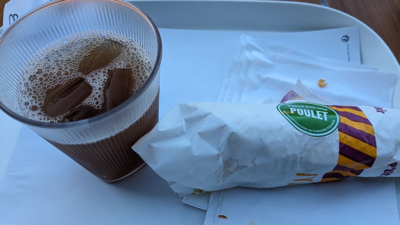 フジェール手前の下り坂のところにあるマックで停車、こちらでお昼にするテラス席が空いてて自転車も置けたので良い。セルフレジの注文でアタフタしつつ何とか買えた。ドリンクとチキンラップS。