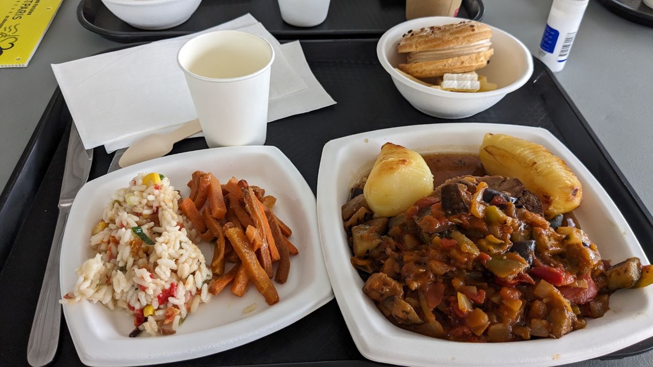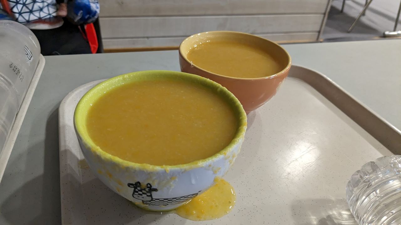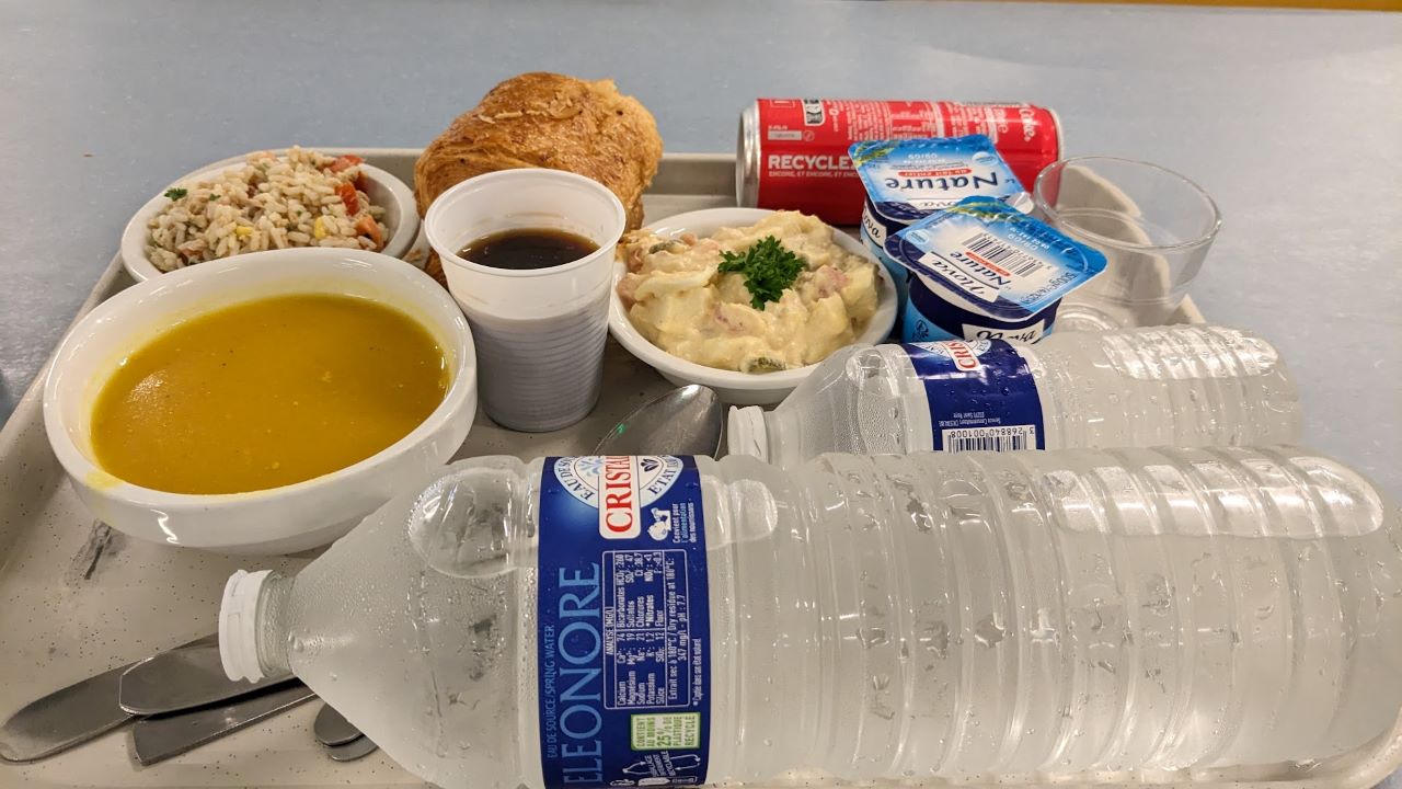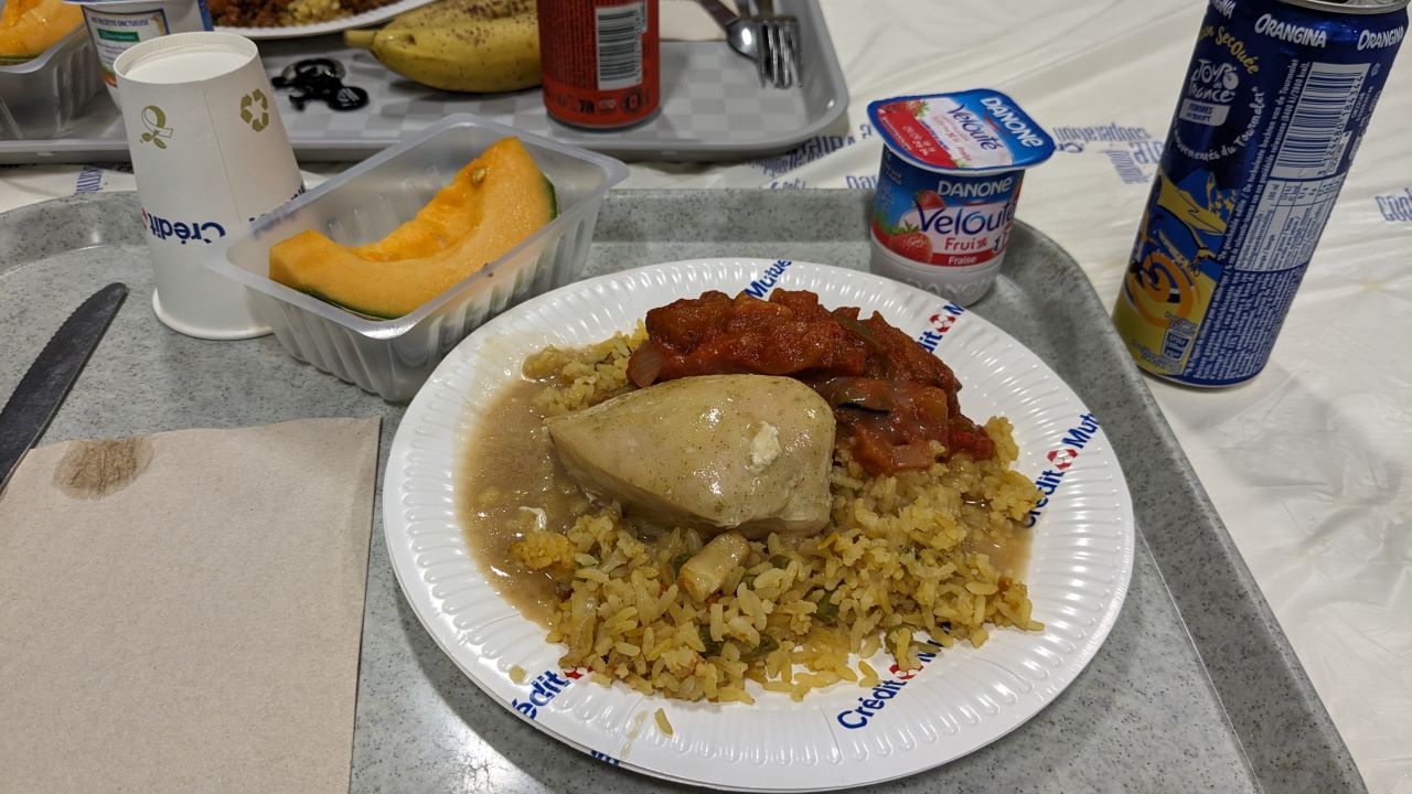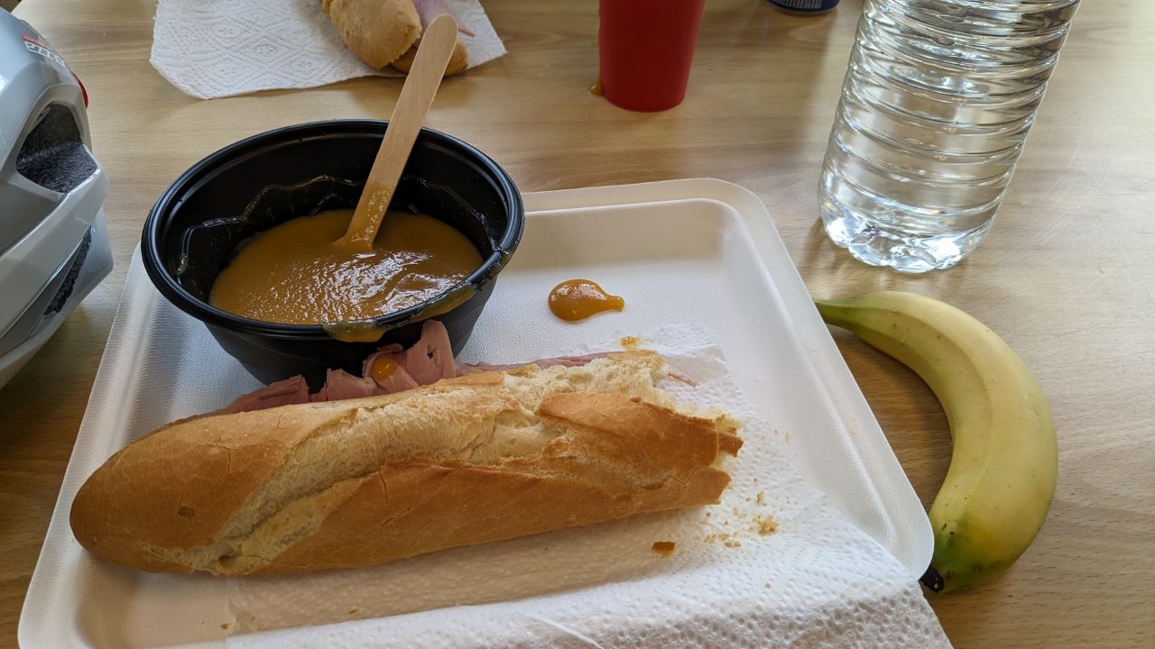 レストランはチケット方式とのことで入口で待っていると軽食は奥だよー(前回もそうだったかも)と言われ移動。紙パックから出てくる謎スープ(冷えてる)を眺めつつ、バナナとサンドイッチと水を買う。フランスパン固いよ…。スープに付けて食べる。
