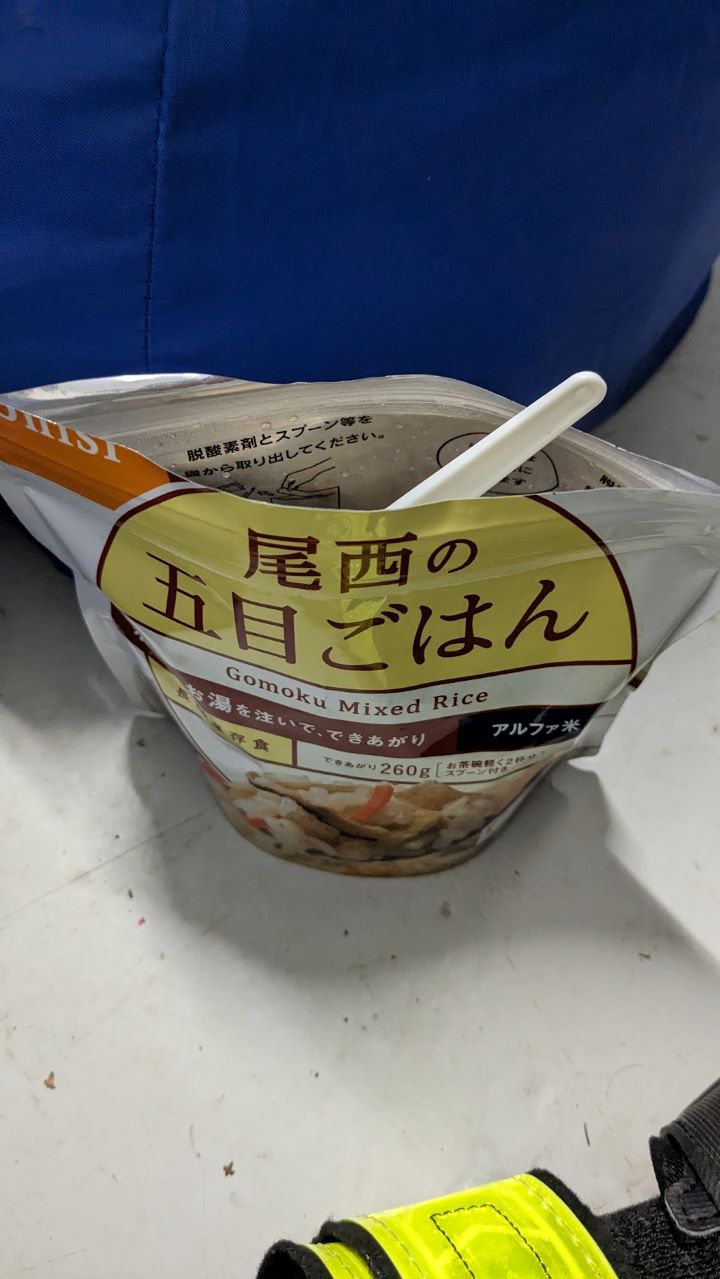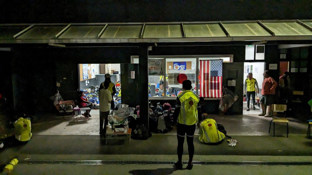 スタンプもらって、ドロップバッグに入れた装備に着替える、バッテリーも交換。補給食は食べた分だけ補充にした。30分くらいうとうとした後準備再開して出発~。
