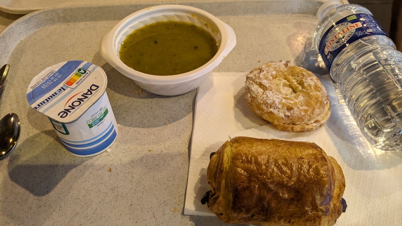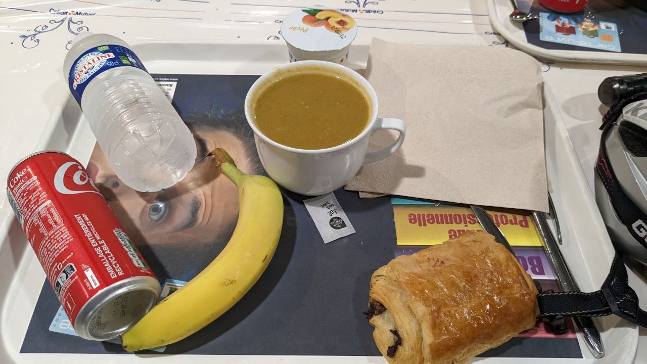 PC1に到着して、スタンプ押してもらって、レストランでバナナ、オランジーナ、謎スープを買い、テーブルでもぐもぐ。