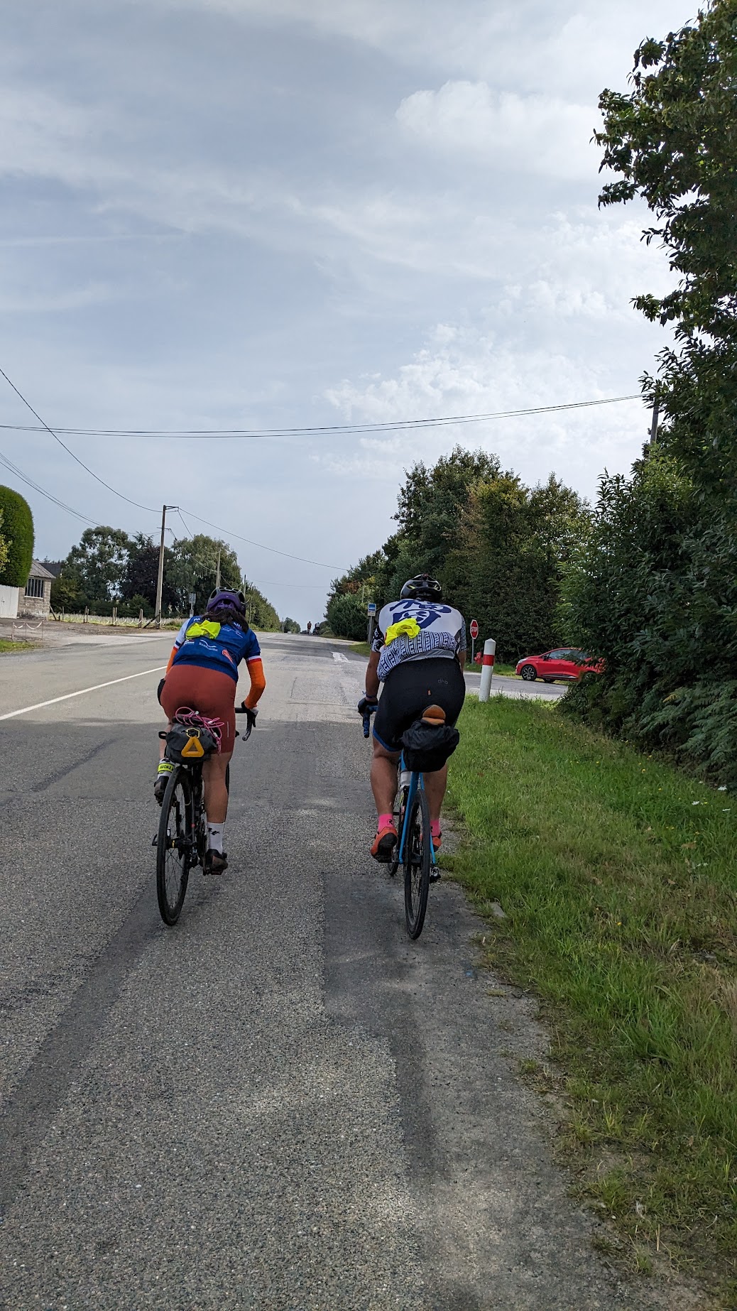 空が明るくなってきて、道も広く下ったり登ったり???まぁまぁな速度が出せるように。この辺りはみんな速度そこそこ出ていて走りやすかったかな。途中で同じカラーリングのTIME車の人をお見掛けしたので声をかけてしまった(´▽`)